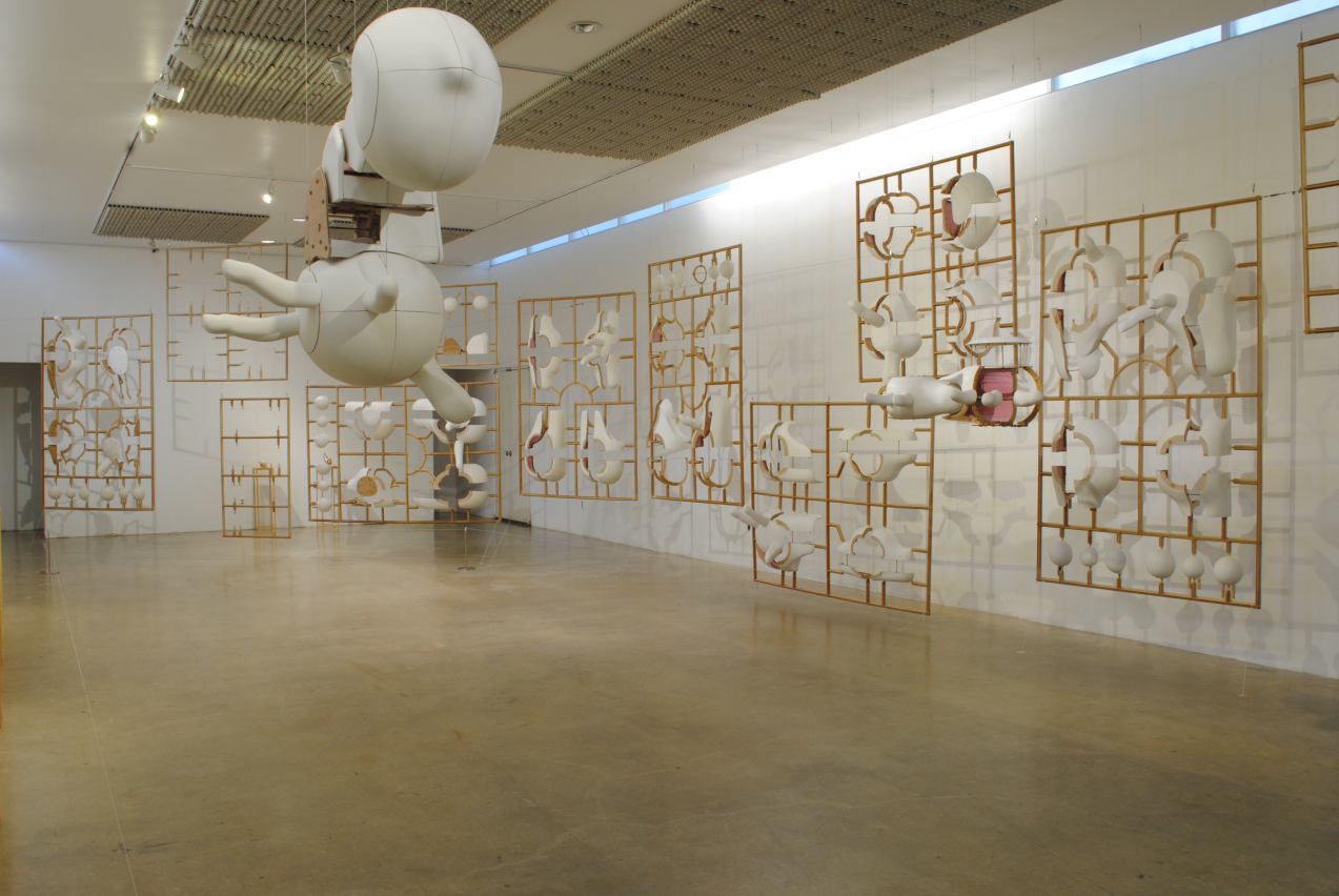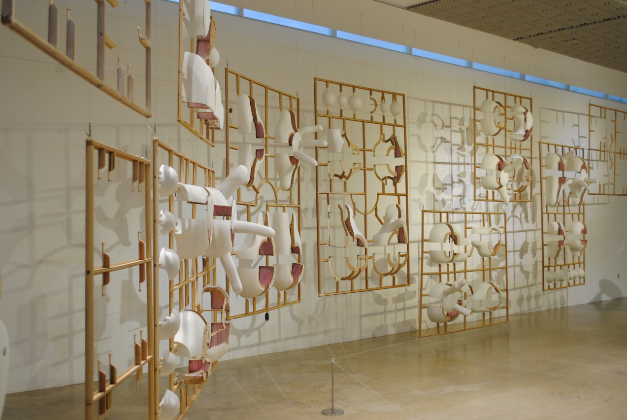 이번 전시 작품은 쉽게 말하면 큰 프라모델이다. 모형을 조립하기 전의 상태와 그것을 조립한 후의 상태를 천장에서 매달아 보여주고 있다. 작품의 모티브는 다리인데, 다리라고 인식할 필요는 없다. 다리의 작품에는 3가지 유형이 있고 각각 무릎 관절의 구조가 축, 공, 여러 개의 축으로 되어 있다. 보통 조각 작품은 형태의 표면밖에 보이지 않지만, 나는 작품의 구조, 즉, 합판과 분홍색 폴리스치렌 등을 모두 보여줌으로써, 재료의 질감과 색깔의 대비를 즐기고 있다. 물론 이번 전시된 작품은 모두 분해와 조립이 가능하다. 프라모델의 틀을 조형적으로 좋아한다. 우선 입체를 평면적인 구조로 변환할 수 있고, 작품을 양면에서 감상할 수 있다. 작품을 분해해서 나열하면 필연적으로 규칙성이 생기고 유사한 형태가 모이면 그 형태는 강조된다. 전시실에 시선을 차단하지 않는 벽을 만들 수 있는 것도 이 구조의 특징으로, 공간이 좁아지지 않으면서 작품 뒤 공간을 볼 수 있고, 벽에는 그림자가 생긴다.