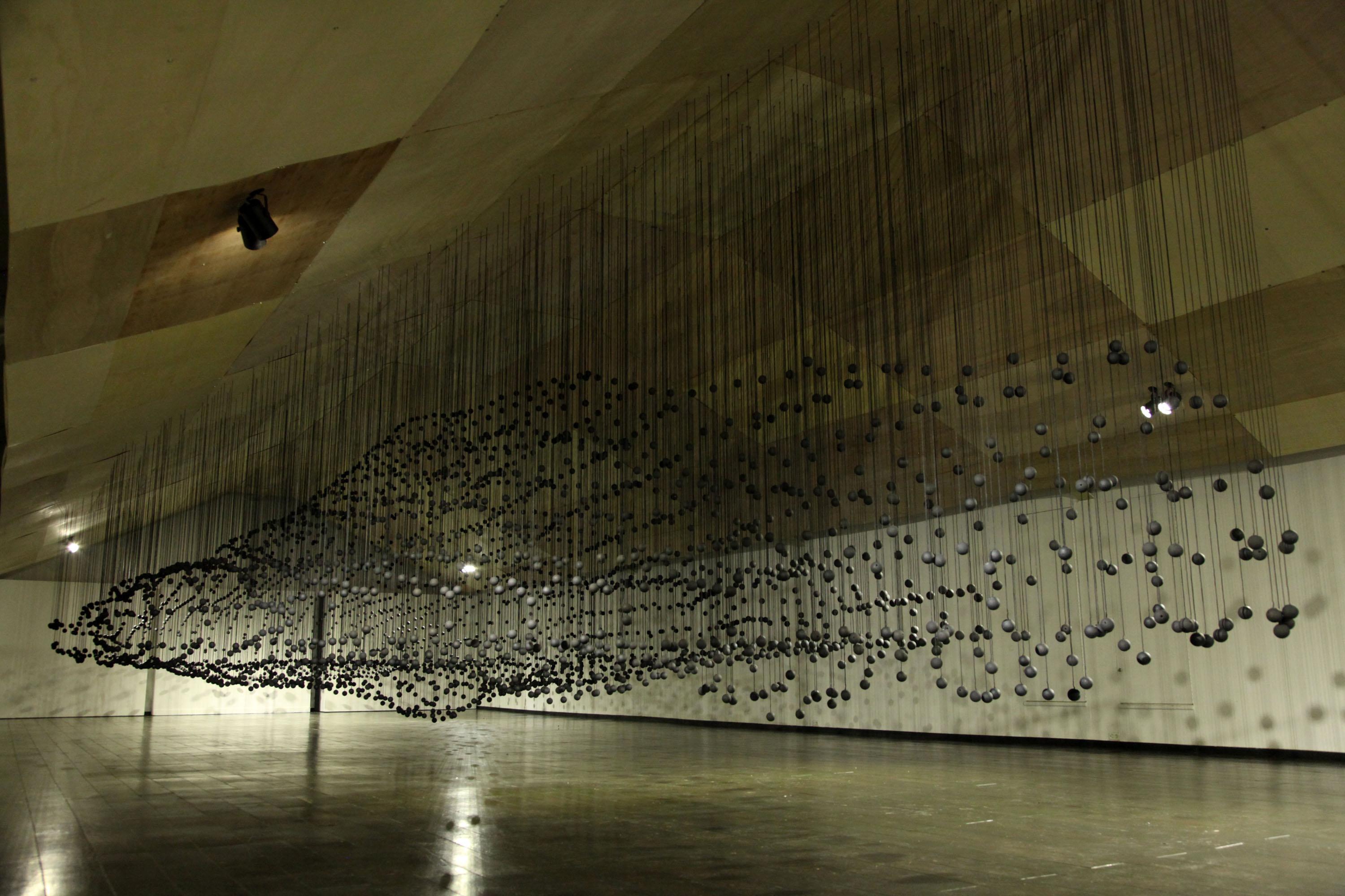 외국 작가 베라 마테오는 3층 멀티 전시공간을 활용해 무언의 시공간성에 대한 관심을 연출한다. 실에 매달려 공중에 떠 있는 4000여개의 공들은 중력을 거슬러 마치 광활한 우주 속에 펼쳐진 듯 부유하고 있다. 즉 통제하기 어려운, 제어할 수 없는 공간성을 임의로 제단하면서 거대한 공간을 탐색하고 있다. 함께 작업을 펼치는 카와타 츠요시는 형태를 결정하는 조건에 대한 관심에서 ‘구조’에 주목한 작업을 이어간다.